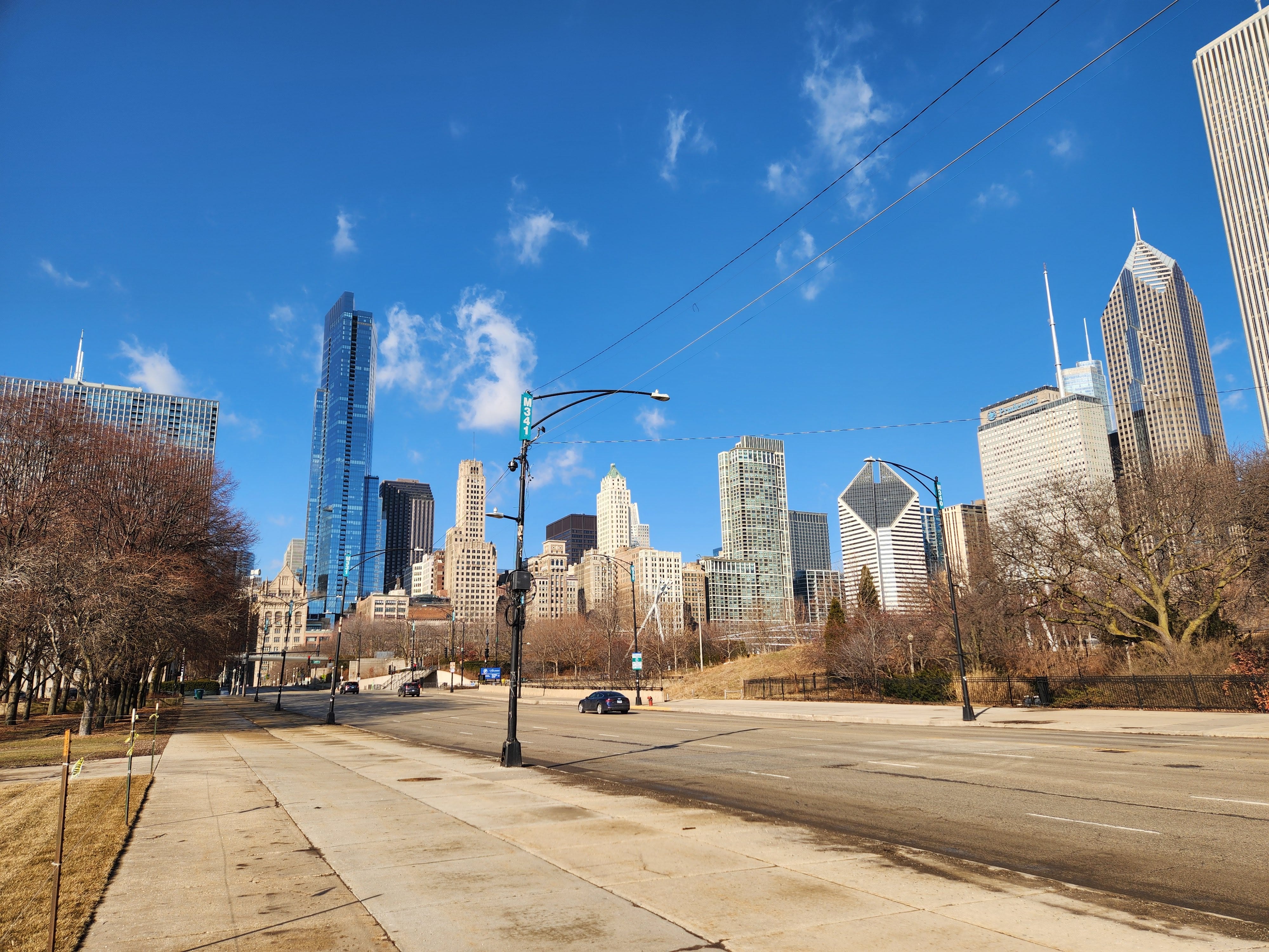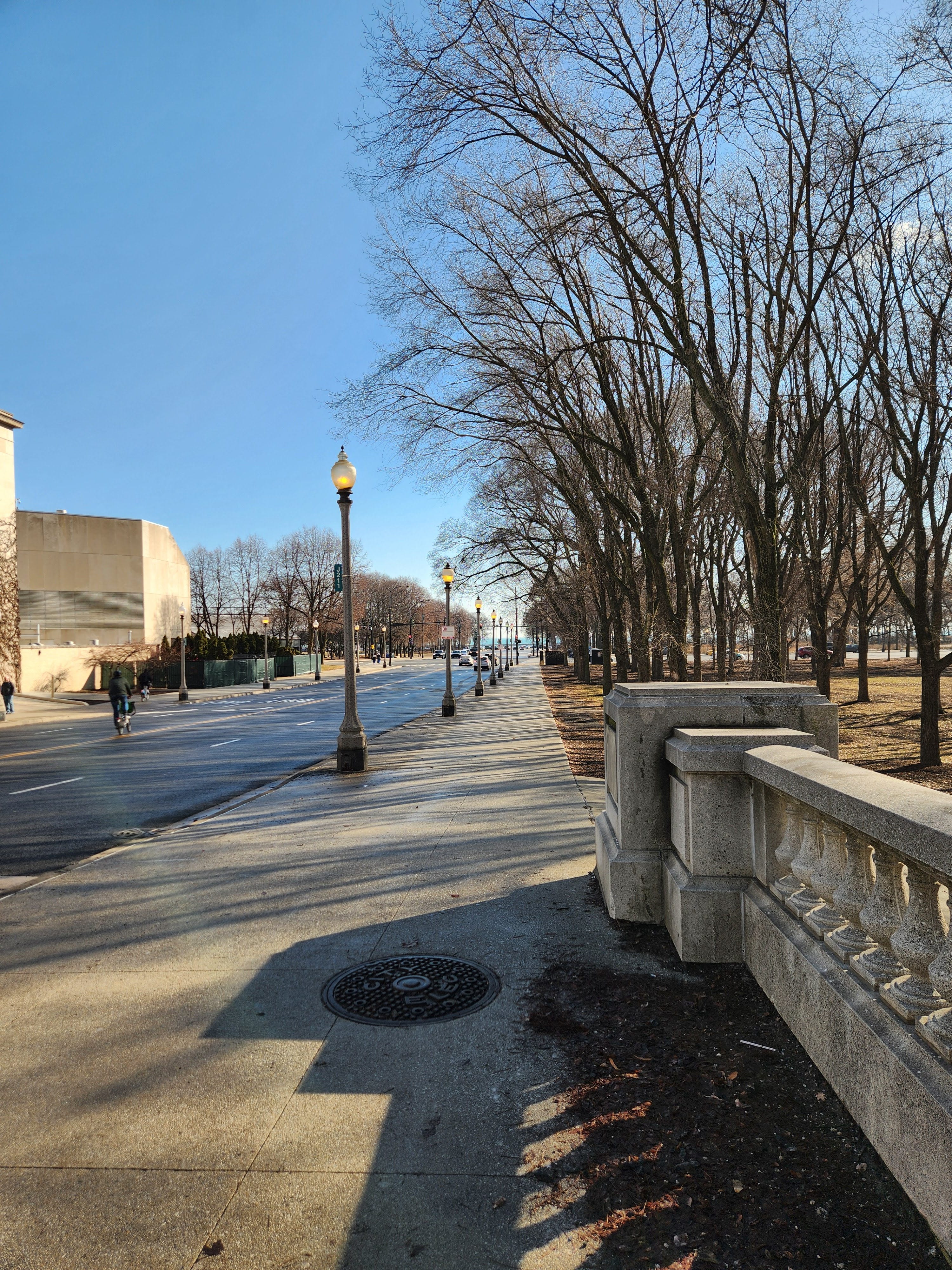 On the way back to the museum campus, I note a runner coming from the path along the lake. She wears a red tank top and black shorts. Her long sleeve is woven through her shirt in the back. On the same sidewalk, a woman pushes a stroller in a full-length jacket and a gray baseball hat.