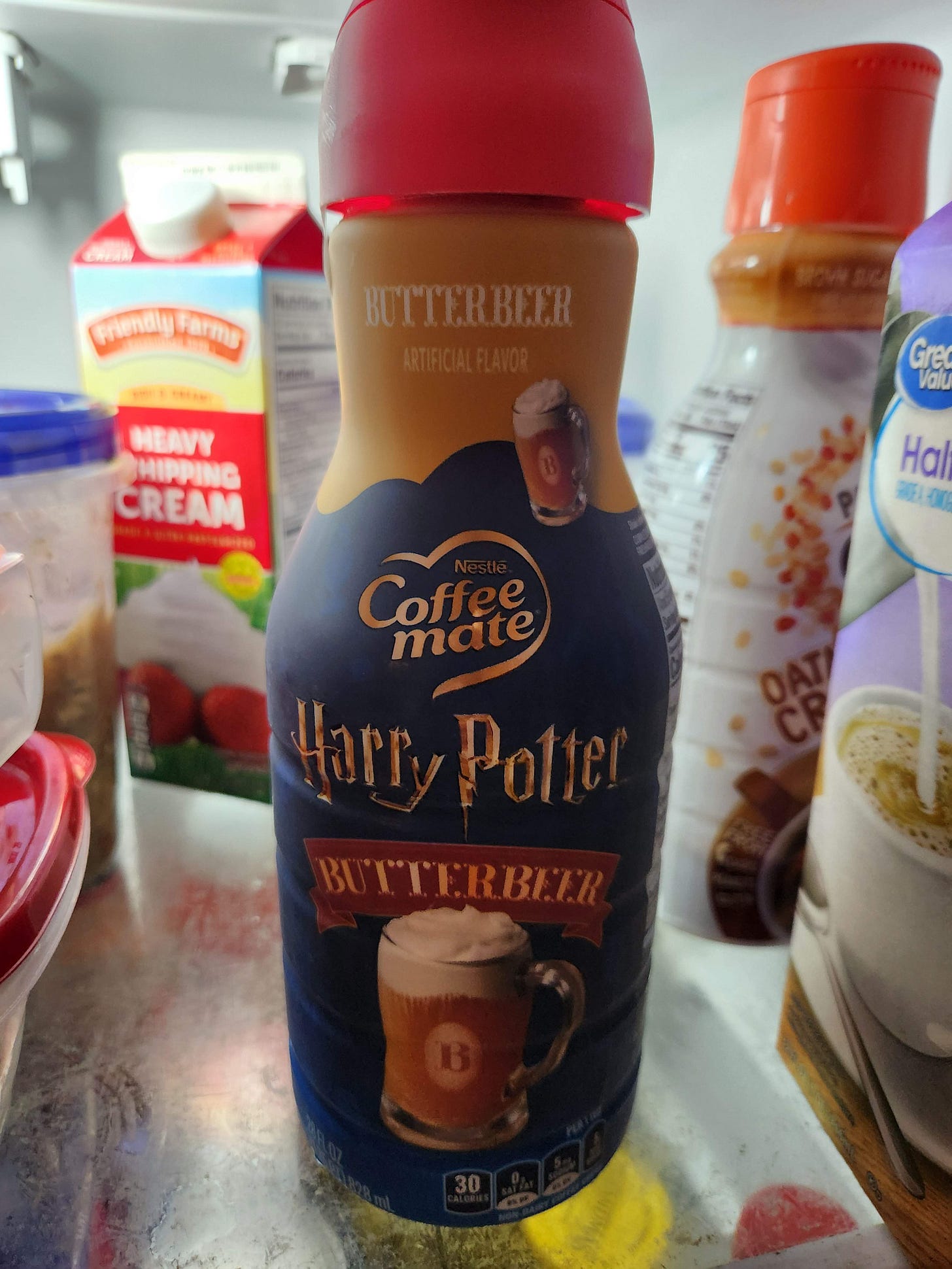 As I write this, I am on the couch writing by a roaring fire and a cup of coffee with Butterbeer creamer. This was an impulse purchase yesterday when I was out.